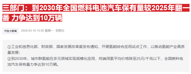 据报道,工业和信息化部、财政部、国家发展改革委发布关于开展氢能综合应用试点工作的通知。其中指出,到2030年,城市群氢能在多元领域实现规模化应用,终端用氢平均价格降至25元/千克以下,力争在部分优势地区降至15元/千克左右;全国燃料电池汽车保有量较2025年翻一番,力争达到10万辆。