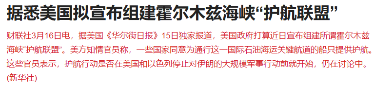 据报道,美国政府打算近日宣布组建所谓霍尔木兹海峡“护航联盟”。