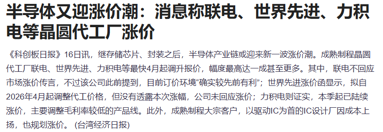 继存储芯片、封装之后,半导体产业链或迎来新一波涨价潮。成熟制程晶圆代工厂联电、世界先进、力积电等最快4月起调升报价,幅度最高达一成甚至更多。