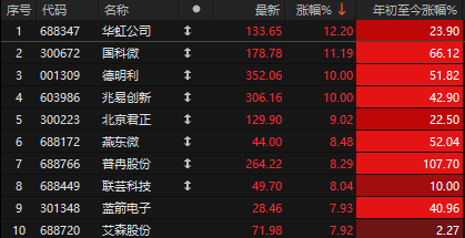 另外,还有华虹7nm先进制程的报道,午盘华虹公司爆拉,一度涨超16%,带动半导体板块回升,德明利、兆易创新涨停。