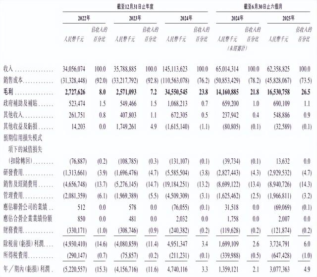 随着销售规模的攀升,赛力斯的业绩也迎来了放量增长。2022年至2024年,赛力斯分别实现收入340.56亿元、357.89亿元和1451.14亿元,其中2024年的增长率高达305.5%;净利润同样在2024年实现了扭亏为盈,达到47.40亿元。