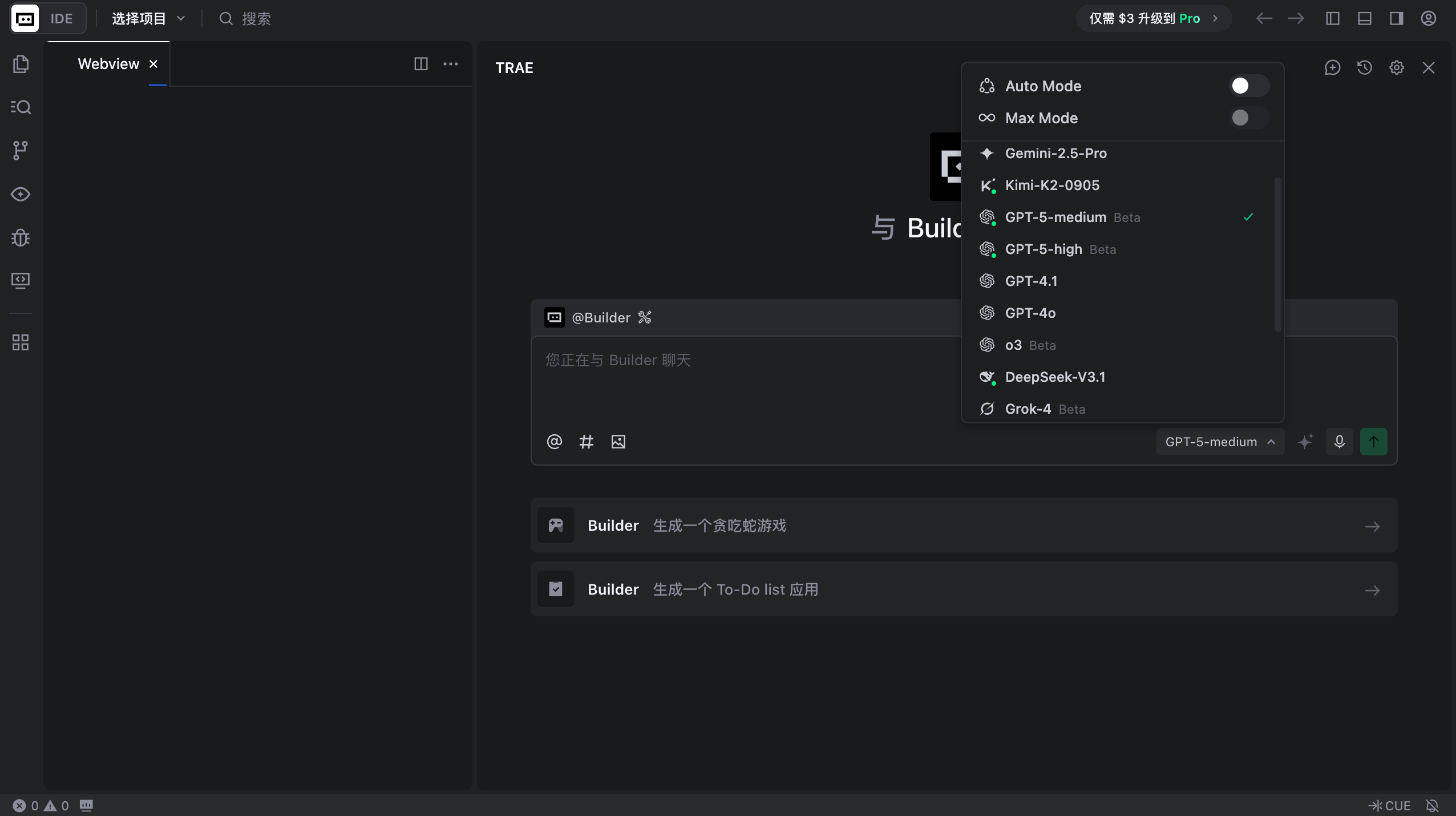 蓝鲸科技查询发现,目前Trae国际版内置了来自OpenAI、谷歌、xAI等公司的多款模型,包括GPT-5、GPT-4.1、Gemini-2.5-Pro、Grok-4等。国内版接入的则是字节Doubao-Seed-1.6、阿里Qwen-3-Coder、Kimi-K2、智谱GLM-4.6、DeepSeek-V3.1-Terminus等模型。