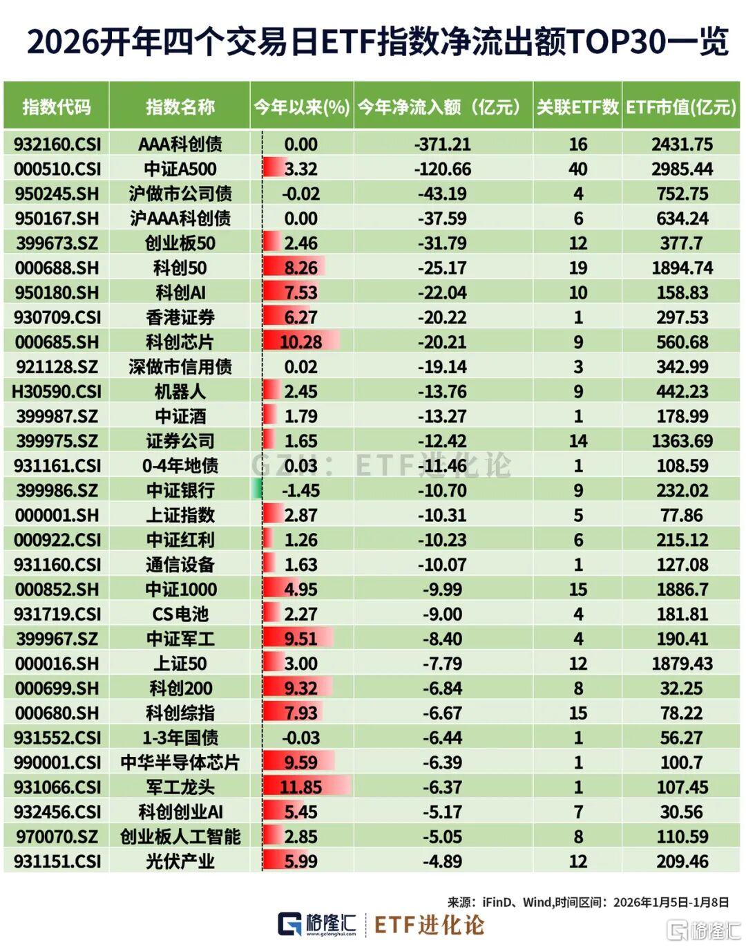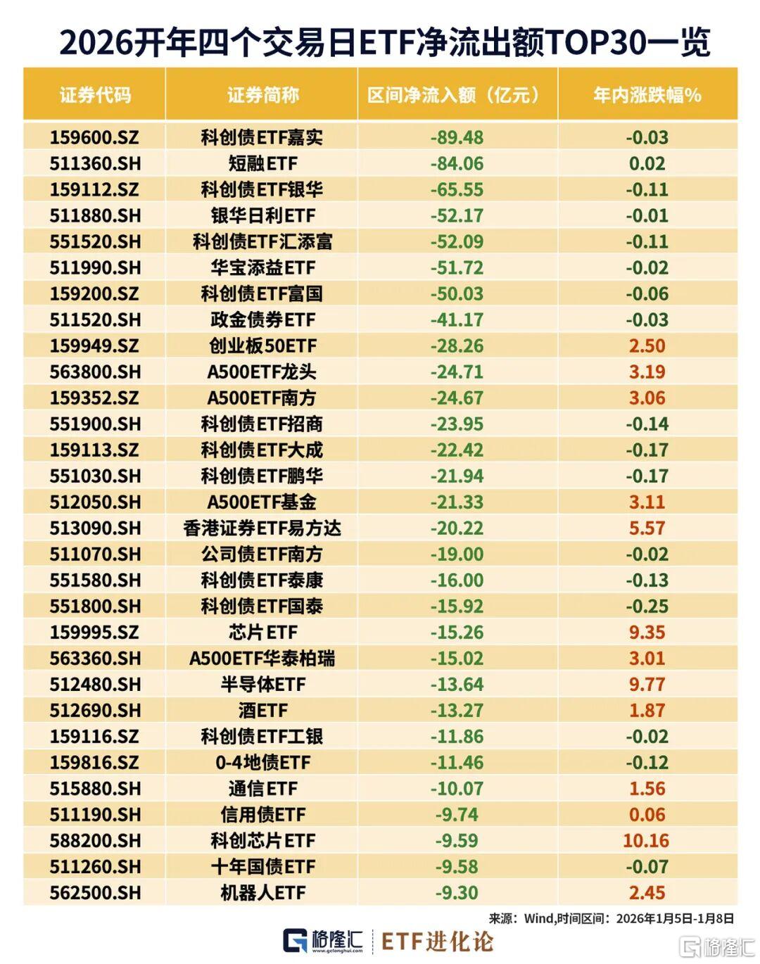 净流出前三的ETF无一例外是债券ETF,科创债ETF嘉实、短融ETF4个交易日净流出超80亿。