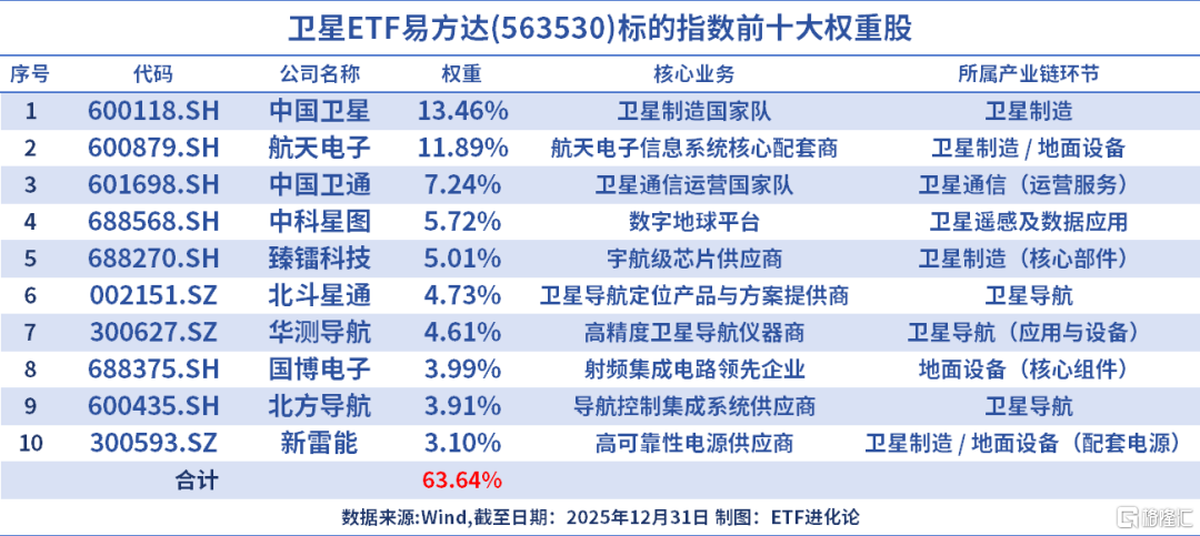 卫星ETF易方达(563530)跟踪中证卫星产业指数,中国卫星、航天电子和中国卫通等前十大权重股覆盖卫星制造、卫星发射、卫星通信、卫星导航、卫星遥感及地面设备等商业航天核心环节,形成“上游核心技术攻关+中游规模化组网+下游应用落地”的立体化投资矩阵。
