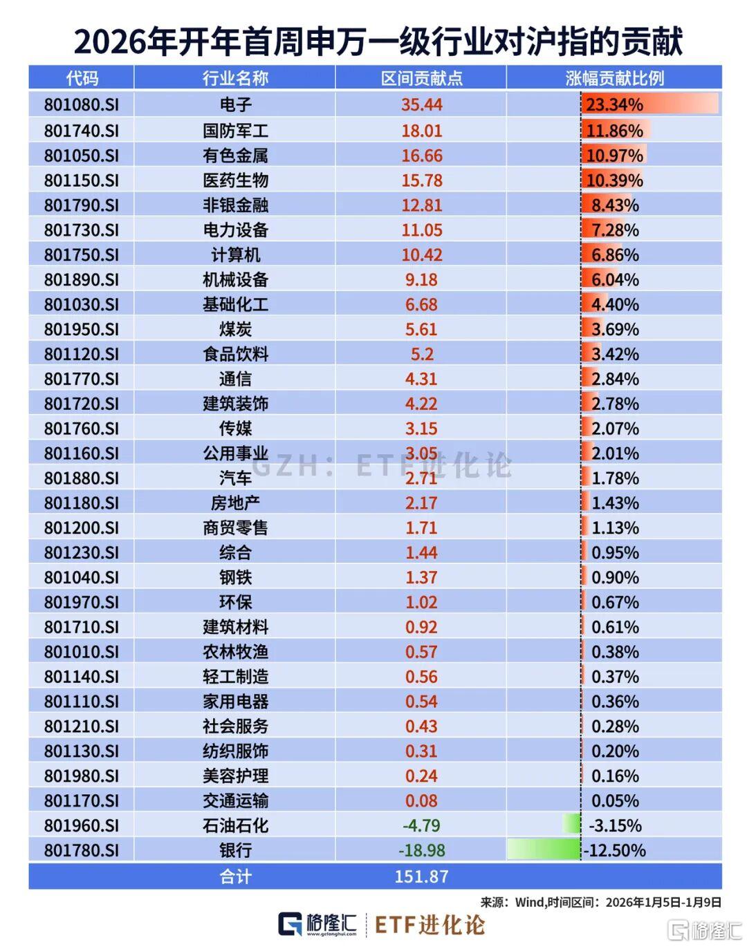 时隔十年再站上4100点的上证指数,开年首周上涨的151点中,电子、国防军工、有色金属和医药生物四大行业贡献过半涨幅。