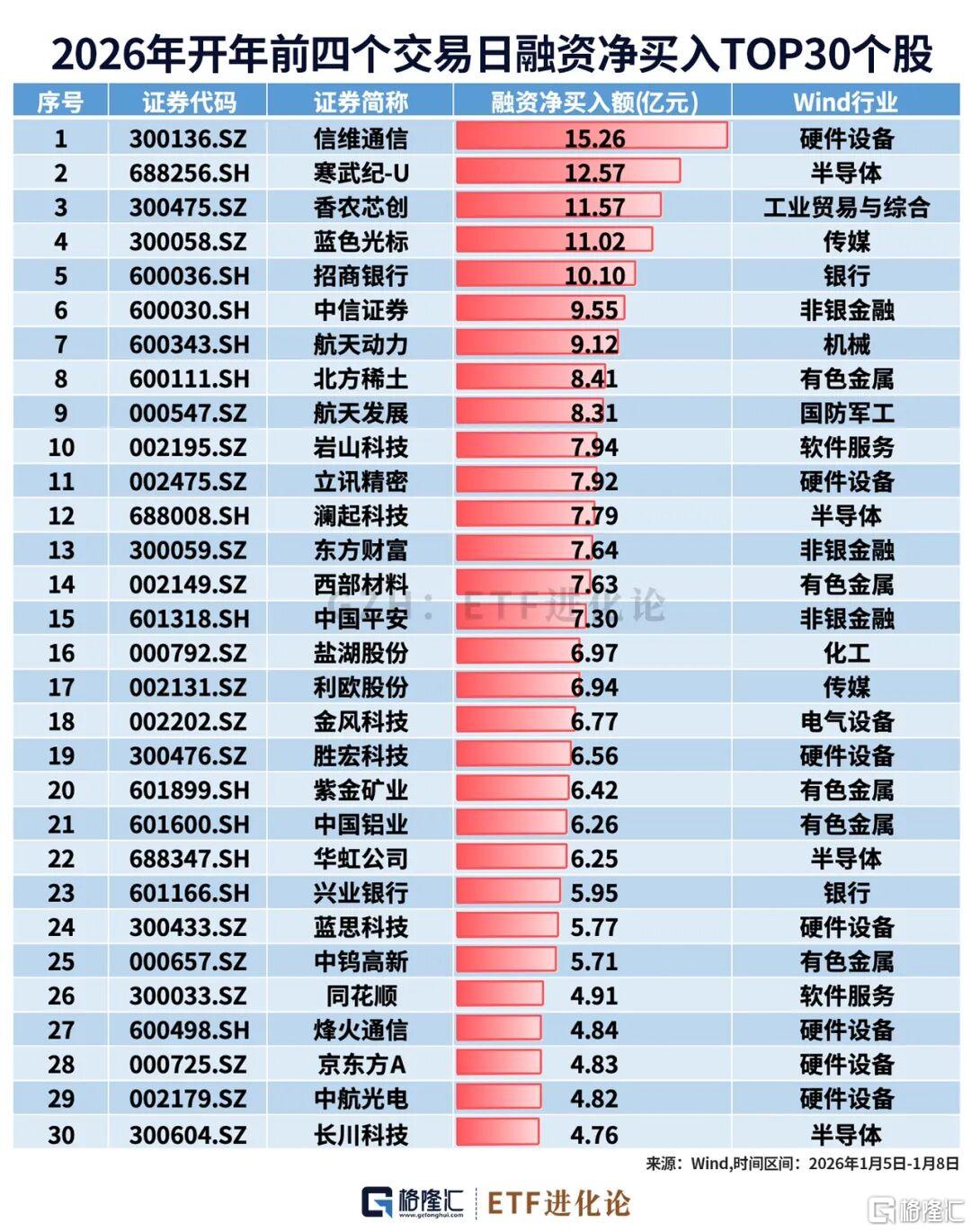 杠杆资金继续偏好硬件设备、半导体、非银金融和有色金属等行业,本周净买入居前的个股有信维通信、寒武纪-U、香农芯创、蓝色光标等。