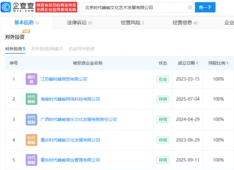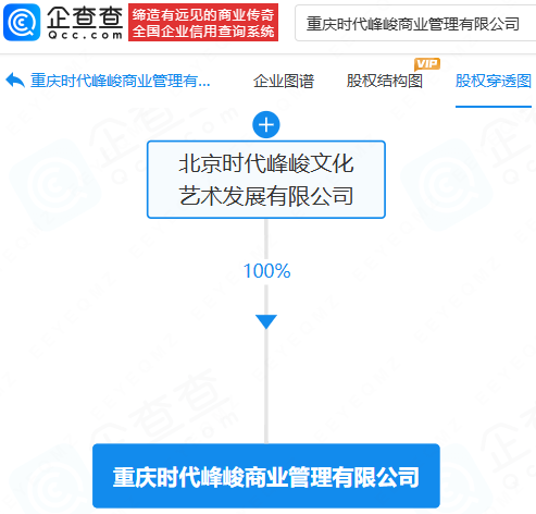 企查查APP显示,近日,重庆时代峰峻商业管理有限公司成立,法定代表人为陈春会,注册资本为100万元,经营范围包含:营业性演出;演出经纪;网络文化经营;电子出版物制作;出版物零售;电影发行;广播电视节目制作经营等,由北京时代峰峻文化艺术发展有限公司全资持股。企查查显示,目前时代峰峻已对外投资成立多家公司。