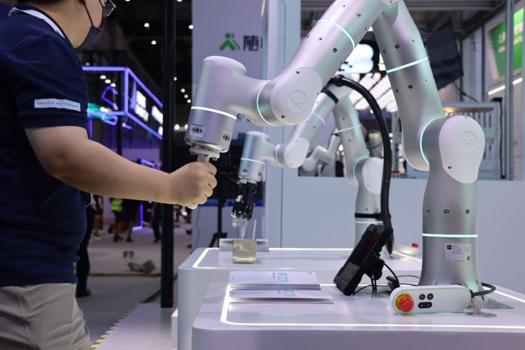 此外,非夕的自适应机器人遥操作应用在本届WAIC首次在国内亮相。现场的操作者控制主机械臂Rizon 4,从属机械臂即可进行同步的实时操作,并给予操作者以精准的力感知反馈。