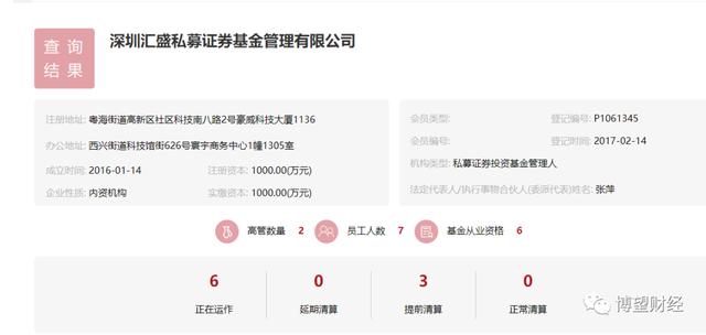 在华软新动力发布的声明中提到,最终实际投资至深圳汇盛私募证券基金管理有限公司,有媒体记者实地探访这家公司的注册地后,发现“查无此地”。而在中国证券投资基金业协会的网站私募基金公司公示栏里,显示这家公司成立于2016年01月14日,注册及实缴资本1000万元,员工7人,于2017年2月14日完成了中基协的私募基金管理人登记,6只正在运作基金,3只基金提前清算,并未显示任何异常。