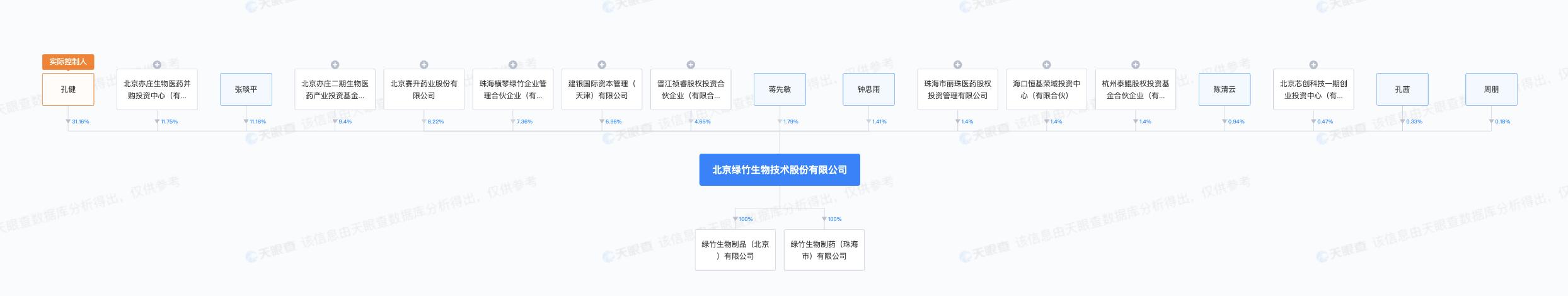 天眼查信息显示,绿竹生物成立于2001年11月,前称为北京绿竹生物技术有限责任公司。目前,该公司注册资本约为1.92亿元,法定代表人为孔健,股东包括孔健、张琰平、赛升药业等。