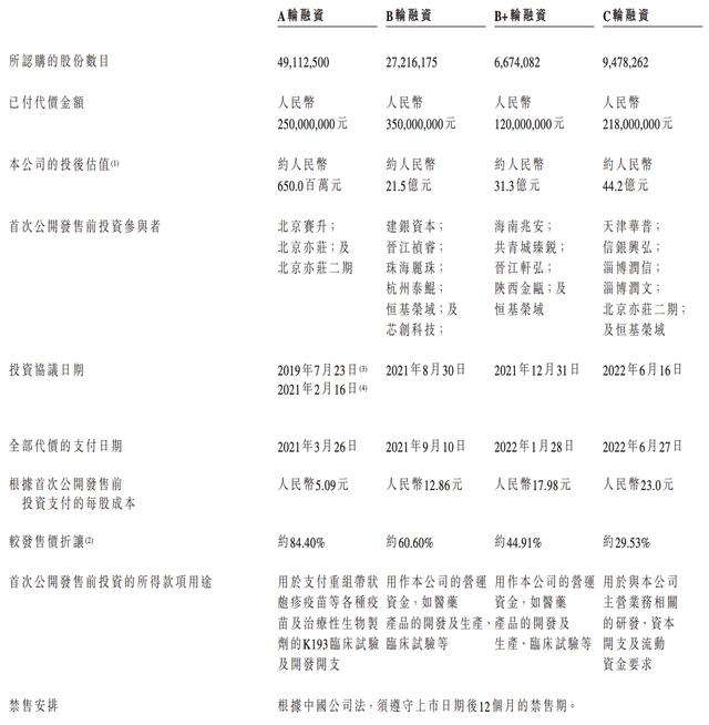 其中,来自A轮融资的所得款项约12.7%(约3180万元)尚未使用,将用于作K193临床试验及开发各种疫苗及治疗性生物制剂的资金;来自B轮融资的所得款项约52.6%(约1.82亿元)尚未使用,将用作运营资金以支援医药产品的开发及生产、临床试验及其他。
