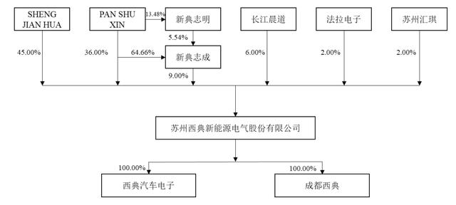 其中,SHENG JIAN HUA持股45.00%,PAN SHU XIN持股36.00%,新典志成持股9.00%,长江晨道持股6.00%,法拉电子、苏州汇琪分别持股2.00%。其中,新典志成、新典志明均为西典新能的员工持股平台。