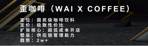 分享一个案例,我们投了一个品牌叫歪咖啡。这个名字是非常有特色的,它的定位是国家级的咖啡饮料,偏向于做国民级的,和瑞幸的商务级有一些不一样。