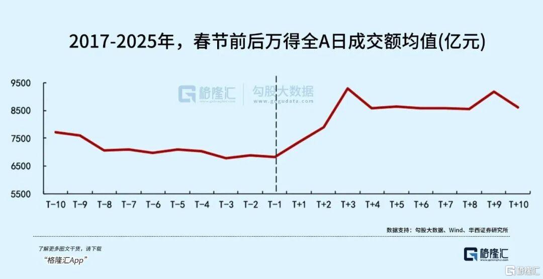 根据机构,复盘2017-2025年,万得全A春节后10个交易日平均涨幅3.3%,春节前10个交易日平均跌幅-1.3%,多数年份节后表现优于节前。