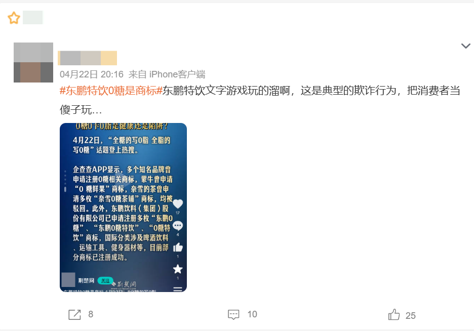 有网友发现,东鹏饮料(集团)股份有限公司已成功注册多枚“东鹏0糖”、“0糖特饮”相关商标。这意味着,印在饮料罐上最醒目的“0糖”二字,法律身份首先是一个“品牌名称”,其次才可能涉及成分。