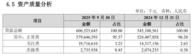 资产质量方面,潜在风险信号值得高度警惕。虽然账面不良贷款率保持相对稳定,但前瞻性指标已亮起“黄灯”。截至2025年三季度末,关注类贷款较上年末大幅增长38%,预示着未来资产质量下迁压力较大。