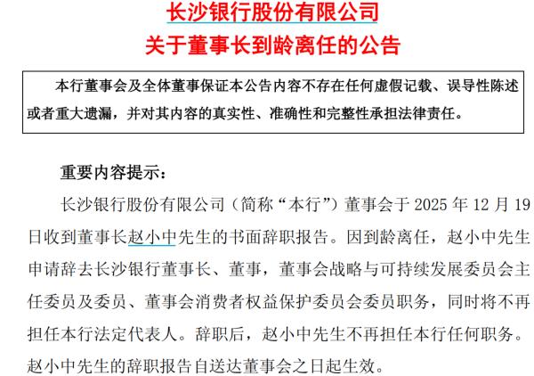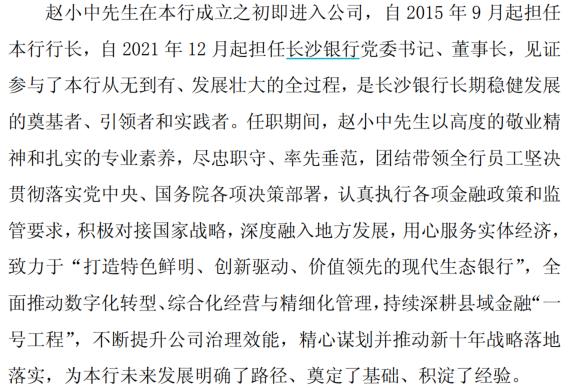 赵小中的离任属于正常的到龄退休。他自1997年长沙银行成立之初便加入,是名副其实的“开行功臣”,服务时间跨越28年。2015年他出任行长,2021年底接任董事长,在其掌舵的四年间,长沙银行实现了资产规模突破万亿、完成全省县域机构全覆盖、获取基金托管资格等关键突破,为银行的发展奠定了坚实基础。
