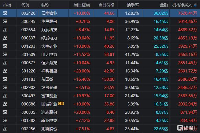 龙虎榜中涉及机构专用席位的个股中,当日净买入额前三为云南储业、华民股份、万润科技,分别为7620.41万元、5014.46万元、4889.32万元。
