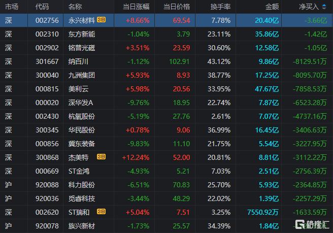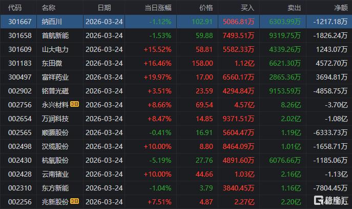 龙虎榜单日净卖出额前三为东方新能、铭普光磁、纳百川,分别为1.42亿元、1.05亿元、8129.51元。