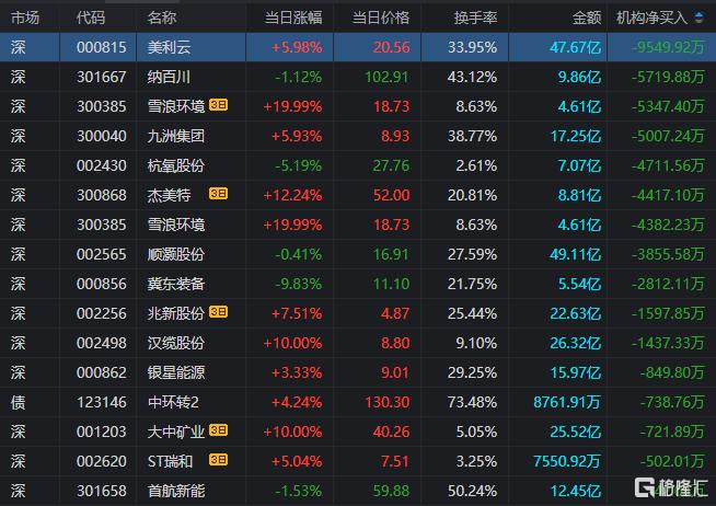 龙虎榜中涉及机构专用席位的个股中,单日净卖出额前三为美利云、纳百川、九州集团,分别为9549.92万元、5719.88万元、5007.24万元。