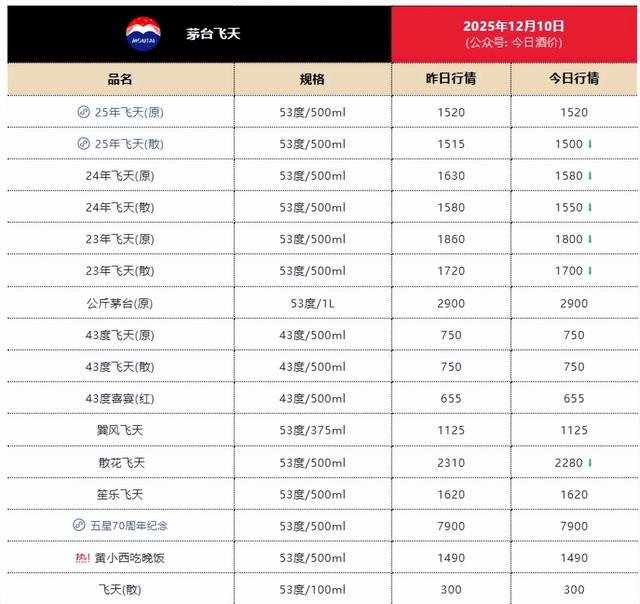 据“今日酒价”平台数据显示,12月10日,2025年53度/500ml飞天茅台散瓶批发参考价已跌至1500元/瓶,较前一日下跌15元,创下历史新低。原箱产品报价为1520元,与前一日持平。这一价格已无限逼近1499元的官方指导价,较两款产品上线时的2220元、2255元累计跌幅均已超过30%。