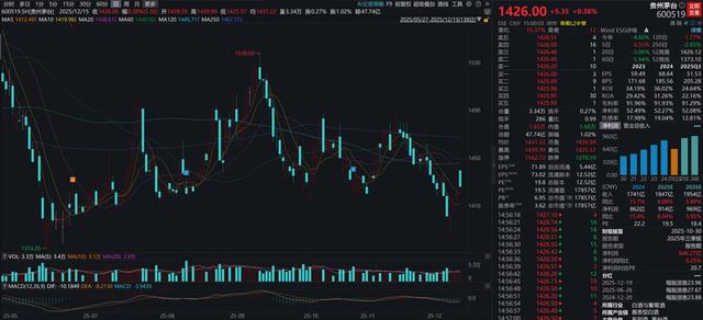 与此同时,资本市场上贵州茅台股价也在考验1400元关口支撑。截至12月15日,贵州茅台股价报1426元,总市值1.79万亿元,较2024年10月的高点1858.44元/股跌幅明显。