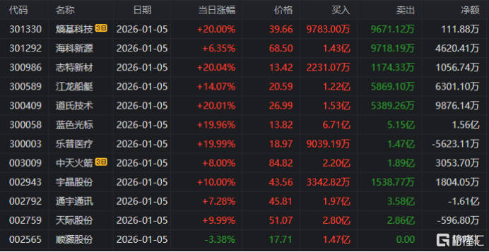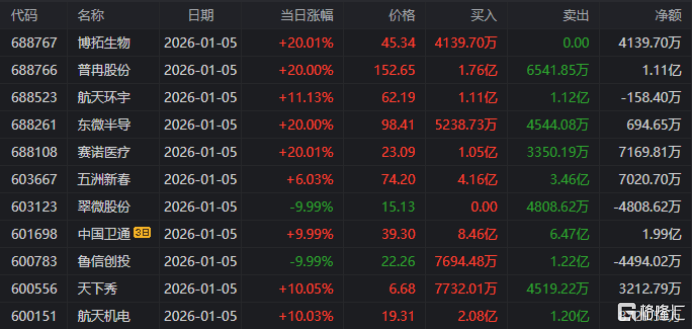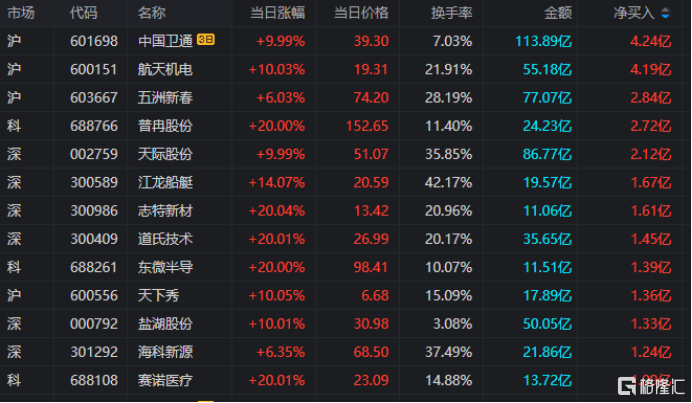 龙虎榜单日净买入额前三为航天机电、五洲新春、普冉股份,分别为4.19亿、2.84亿、2.72亿。