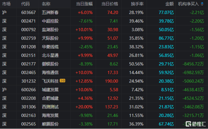 龙虎榜中涉及机构专用席位的个股中,单日净卖出额前三为五洲新春、中超控股、盐湖股份,分别为2.21亿、2.20亿、1.56亿。