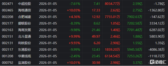 龙虎榜单日净卖出额前三为蓝色光标、中超控股、鲁信创投,分别为4.22亿、4.14亿、3.43亿。
