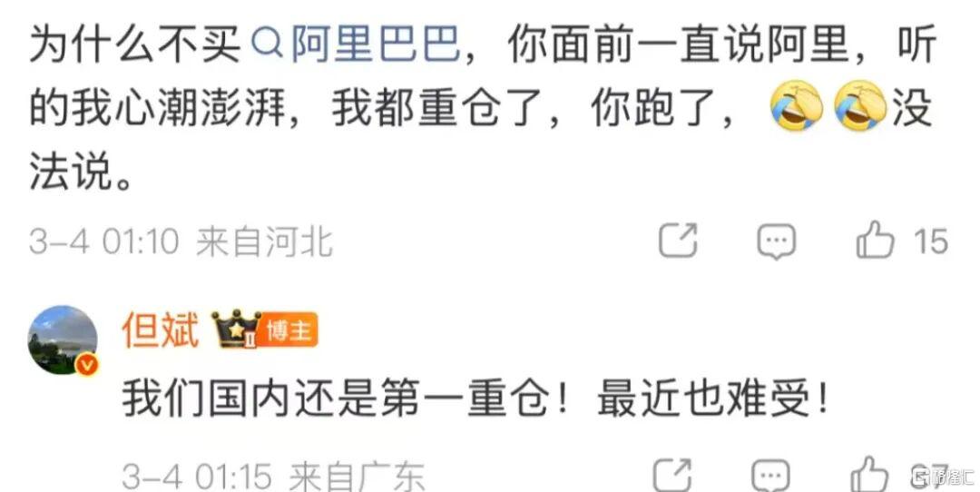 有网友评论:为什么不买阿里巴巴,你面前一直说阿里,听的我心潮澎湃,我都重仓了,你跑了,没法说。