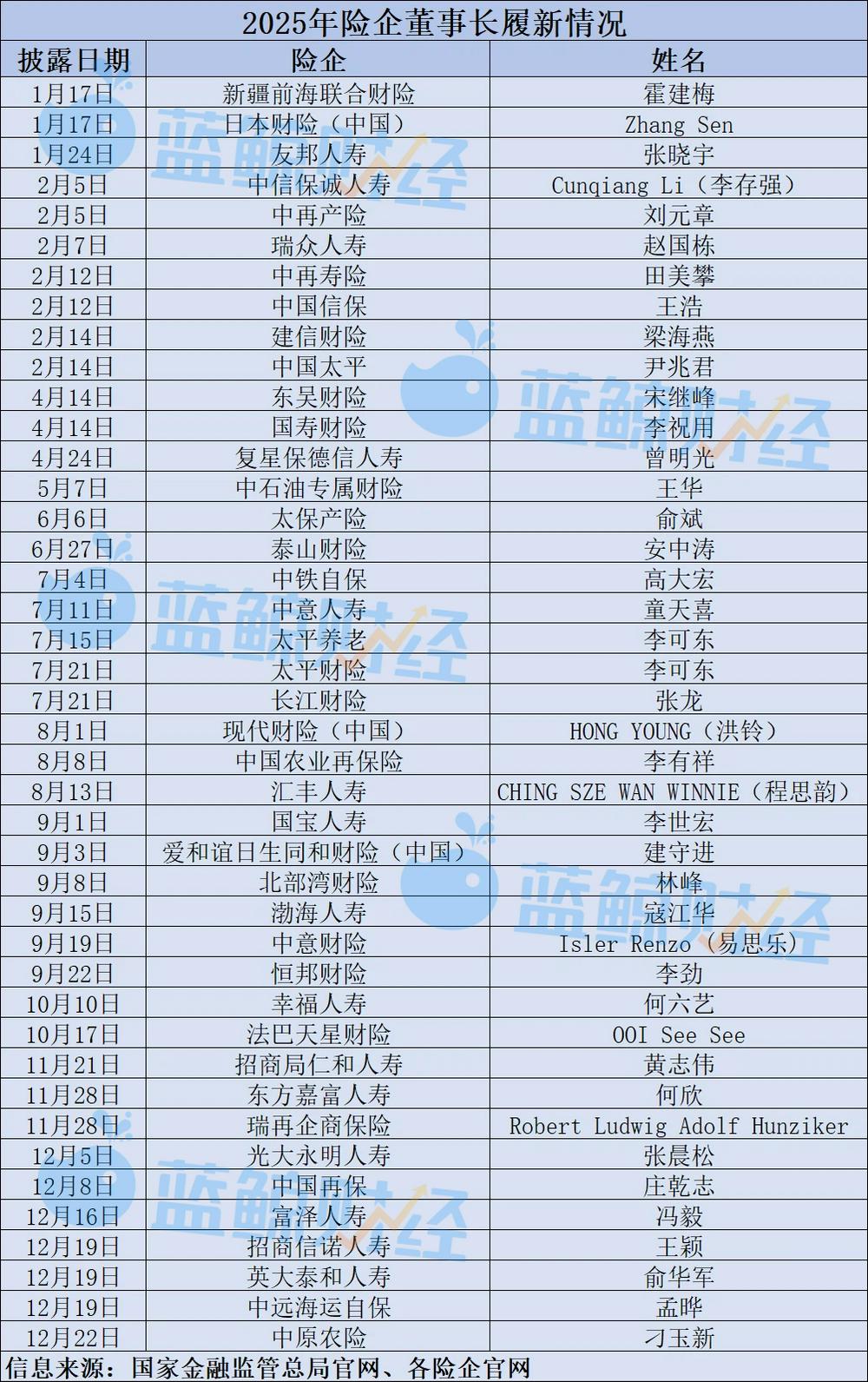 蓝鲸新闻12月31日讯(记者 陈晓娟)2025年,保险行业迈入深度调整期,险企“一把手”换防提速。蓝鲸新闻记者根据监管批复不完全梳理,年内至少有42家险企迎来新任董事长。