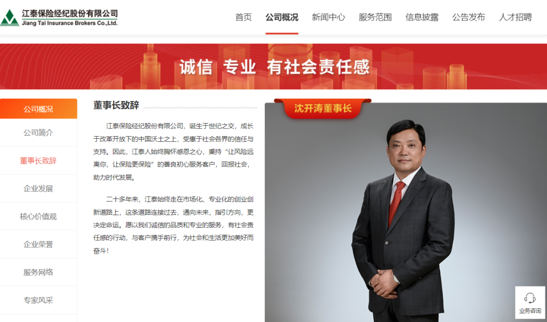 官网的“董事长致辞”一栏中提及:二十多年来,江泰保险经纪始终走在市场化、专业化的创业创新道路上,这条道路连接过去,通向未来,指引方向,更决定命运。