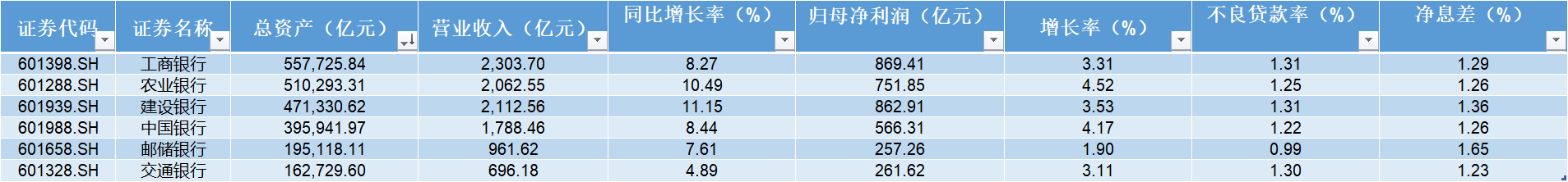其中,农业银行以4.52%的归母净利润同比增幅领跑六大行;中国银行归母净利润增速同样超过4%,为4.17%;建设银行、工商银行、交通银行归母净利润同比增速在3%以上,同比分别增长3.53%、3.31%、3.11%;邮储银行归母净利润增速垫底,为1.90%。