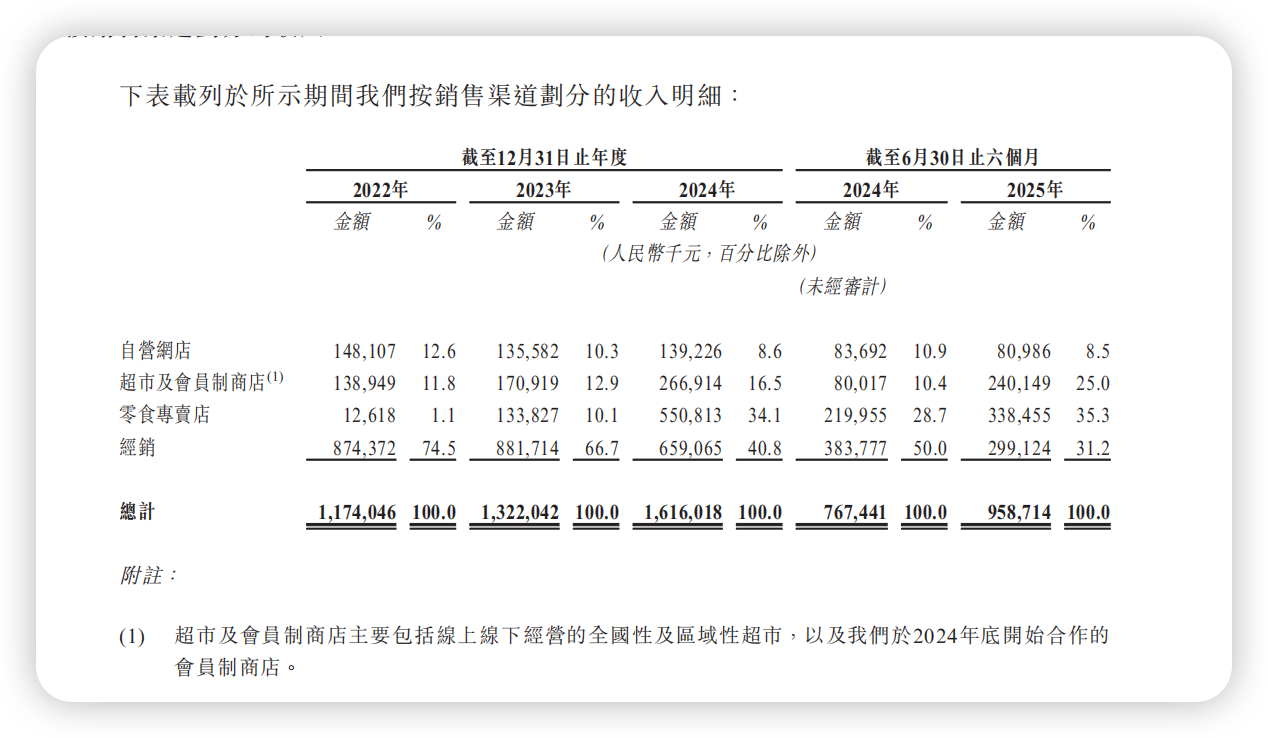 值得一提的是,与众多休闲零食品牌一样,面对量贩零食与会员制商超的崛起,溜溜果园的渠道结构正经历深刻调整,成为行业渠道变迁的一个缩影。其最新招股书显示,传统经销渠道收入占比已从2022年的74.5%降低至2025年上半年的31.2%;零食专卖店渠道异军突起,占比从同期的1.1%升至35.3%,反超了经销渠道成为企业销售渠道支柱。