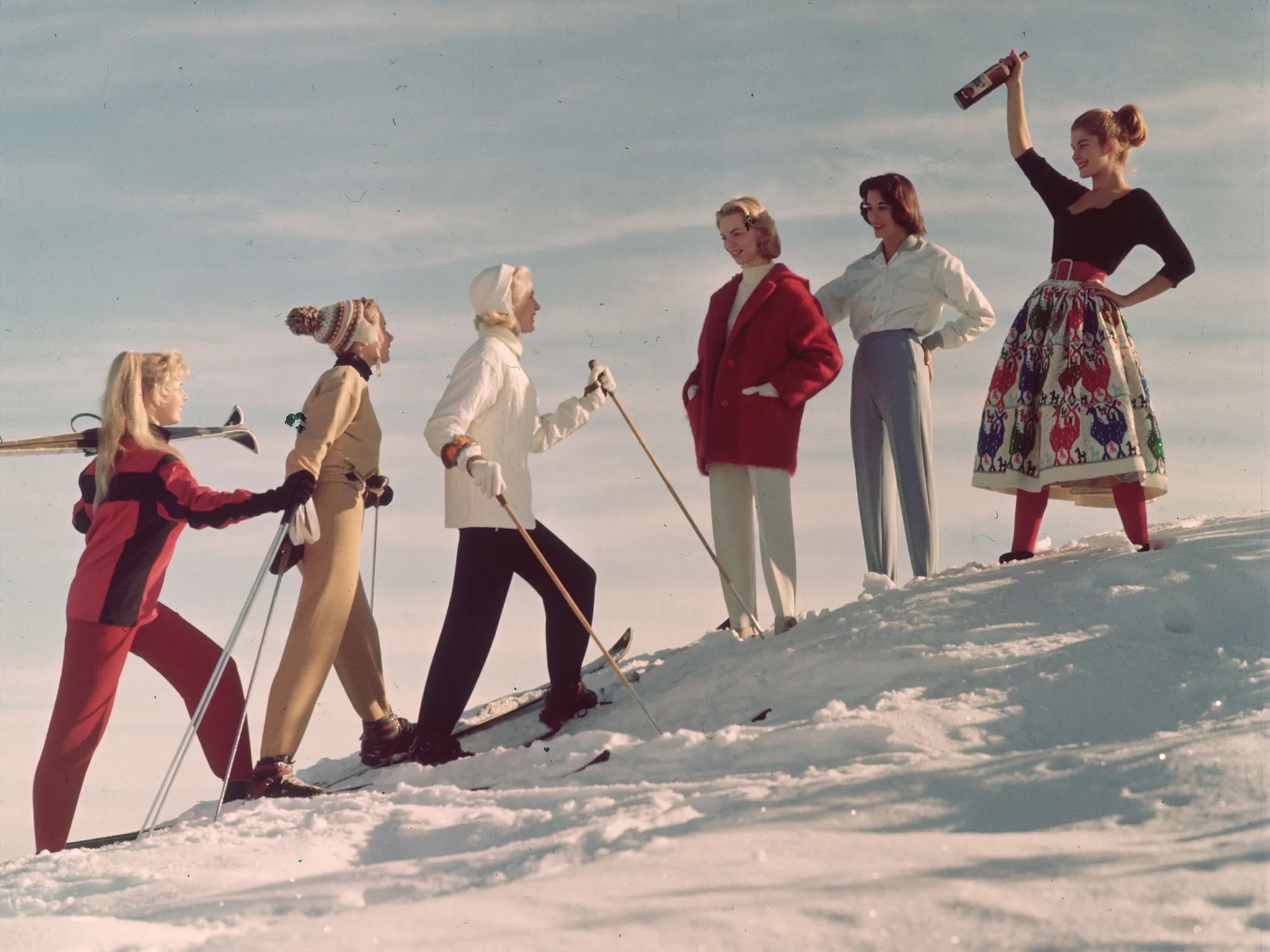 随后,滑雪穿搭继续向风格化演进。1952年,德国时装设计师兼职业滑雪运动员Maria Bogner推出了首款弹力滑雪裤,以尼龙与羊毛混纺面料打造,并采用宝蓝、红色等明亮色彩,在当时以深色调为主的滑雪服市场中极具突破性。这种色彩鲜明、线条修长的裤装迅速在雪场走红,玛丽莲·梦露与碧姬·芭铎等明星的穿着进一步放大了影响力,使这种造型从雪场延伸到街头时尚。