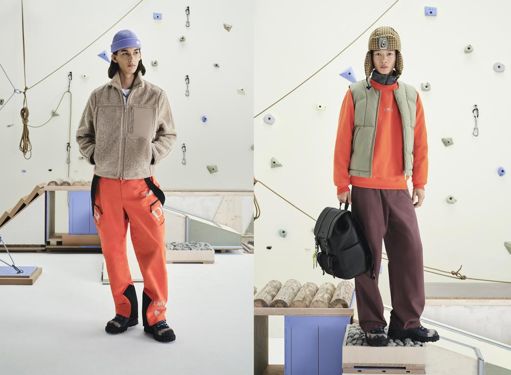 本季系列涵盖成衣与多款配饰,包括耳罩、太阳眼镜、功能腰带、尼龙手袋及多种靴履设计。配色以冰霜粉、乳白、松木绿、深海军蓝与幻彩黑为主,在柔和与对比之间取得平衡。主要造型包括塔夫绸羽绒外套及裤装套装、可双场景穿着的双色羽绒外套,以及菱格纹针织与涂层裤装组合,兼顾冬季防护性能与品牌标志性视觉语言。