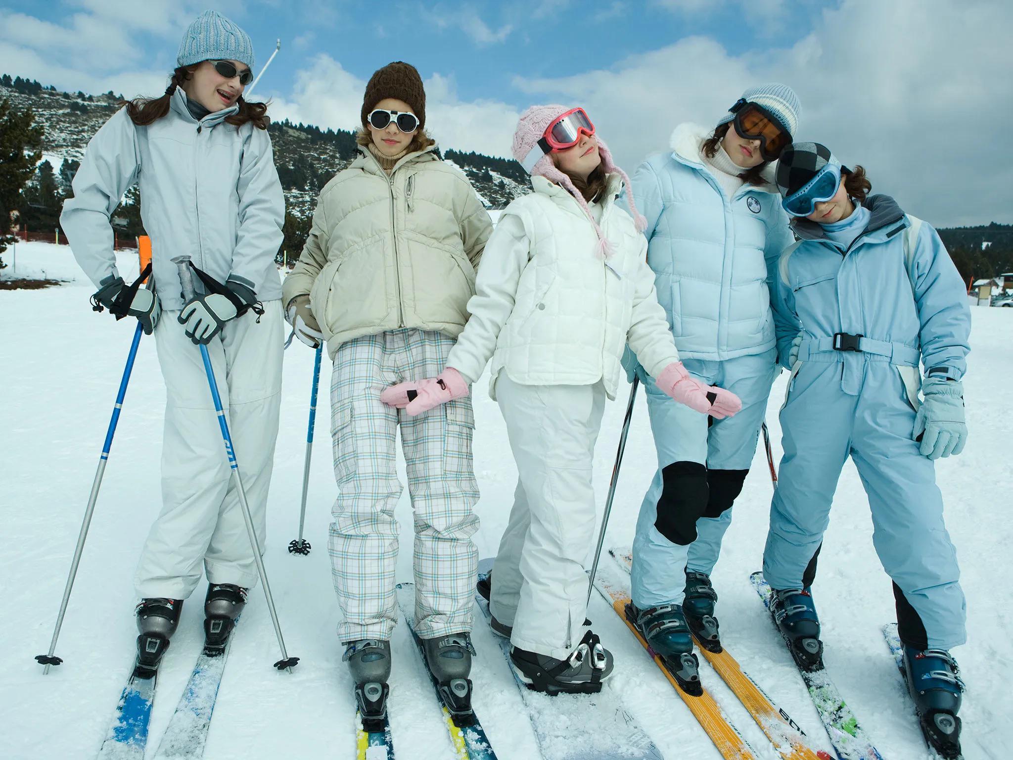 进入21世纪初期,滑雪造型更加前卫与年轻化,外套多为绗缝设计,配有仿皮草连帽。同时,配色也从上世纪流行的荧光亮色转向粉蓝、米白、浅驼等柔和色调。到了2010年前后,金属光泽雪服与反光滑雪镜也再次流行,成为新一代滑雪风格标配。