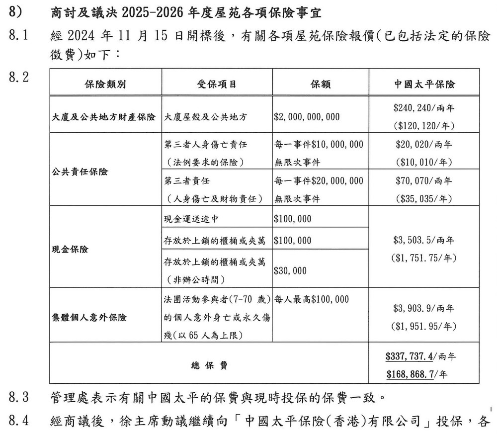 据宏福苑业立案法团2024年12月披露的会议纪要,经开标后,法团决议2025-2026年度屋苑保险事宜:投保大厦及公共地方财产保险、公共责任保险、现金保险和集体个人意外保险,承保方为太平香港,总保费为33.77万港元/两年。
