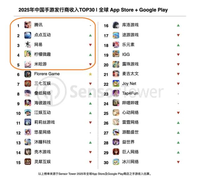 Sensor Tower 数据显示,2025年TOP 30中国手游发行商全球吸金233亿美元,与2024年基本持平,达到全球TOP100手游发行商收入的35%;其中,米哈游排在腾讯、点点互动、网易和柠檬微趣之后,而前些年名列第二。
