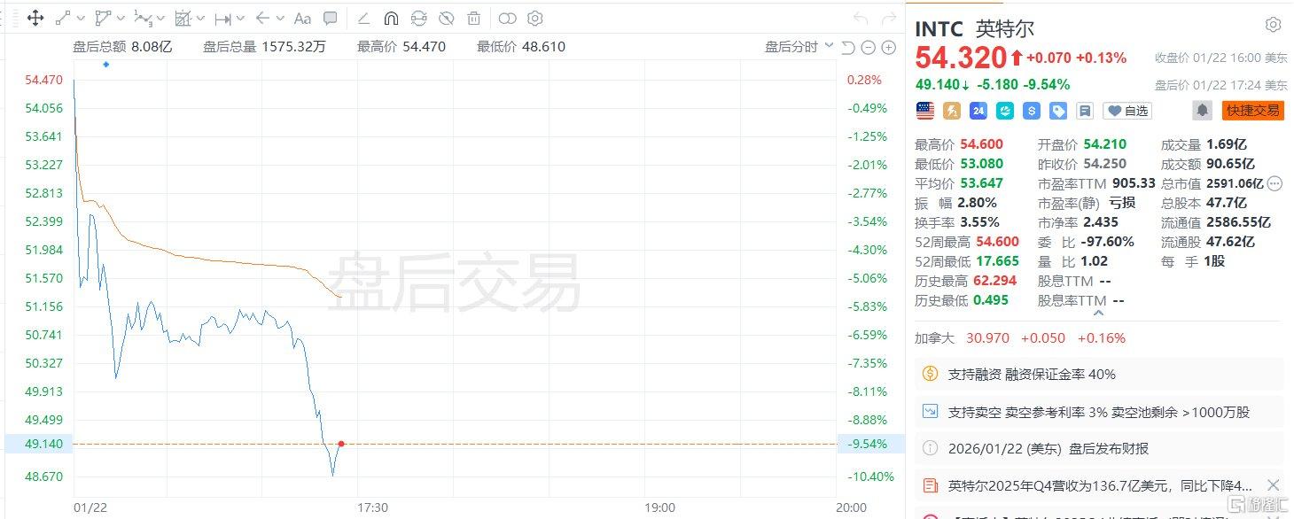 英特尔公司公布了截止2025年12月27日的第四季度及全年财务报告。财报显示,英特尔第四季度营收为137亿美元,同比下降4% 。在通用会计准则(GAAP)下,净亏损达到6亿美元,每股亏损0.12美元,去年同期净亏损为1亿美元。尽管数据中心业务有所回暖,但受PC市场需求波动及供应链短缺影响,公司给出的2026年第一季度业绩指引大幅低于市场预期,预计第一季度非GAAP每股收益仅为0.00美元。财报公布后,英特尔股价盘后大跌近10%,报49.14美元。