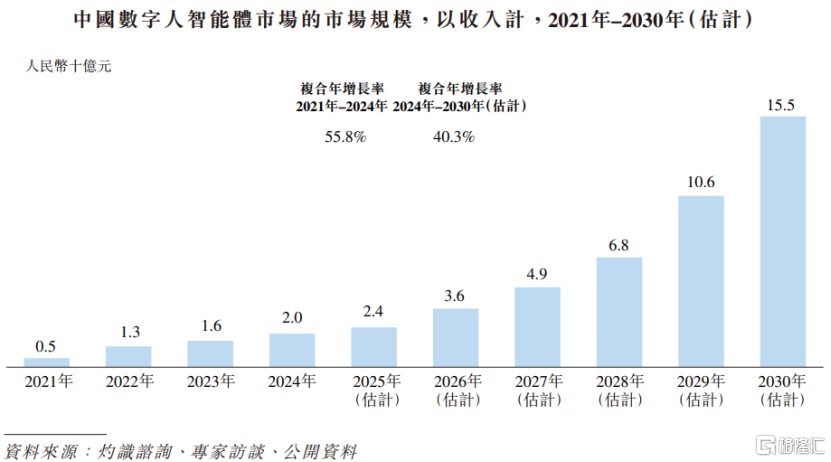 从收入来看,中国数字人智能体市场规模从2021年的5亿元增加至2024年的20亿元,复合年增长率为55.8%;预计到2030年将达到155亿元,2024年至2030年的复合年增长率为40.3%。