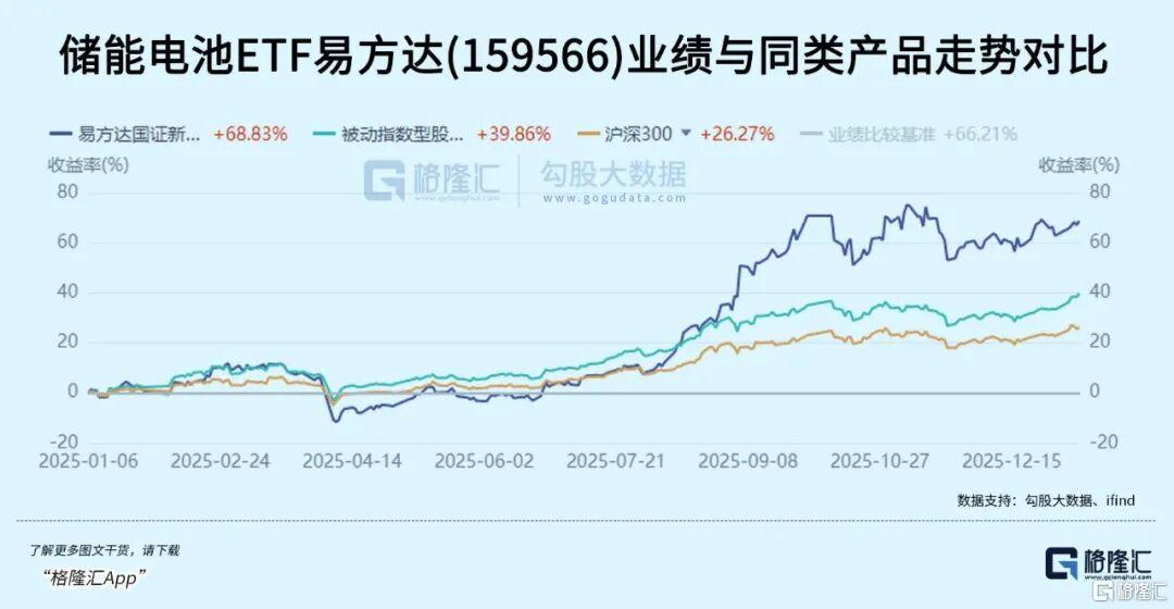反映在资本市场上,这些核心巨头的经营业绩强劲发展势能,也让储能板块在资本市场表现在一众硬科技赛道中脱颖而出,2025年,国证新能源电池指数强势上涨55.15%,显著跑赢多数行业。跟踪这一指数的储能电池ETF易方达(159566)实现量价齐涨,全年强势上涨57.96%。