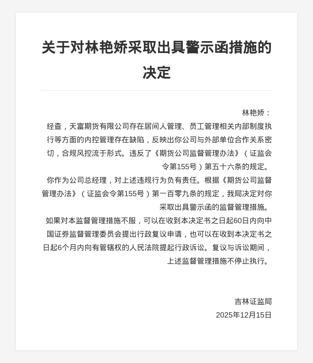 针对以上问题,吉林证监局现决定对天富期货有限公司采取责令改正的监督管理措施,对林艳娇、韩钰昴采取出具警示函的监督管理措施。