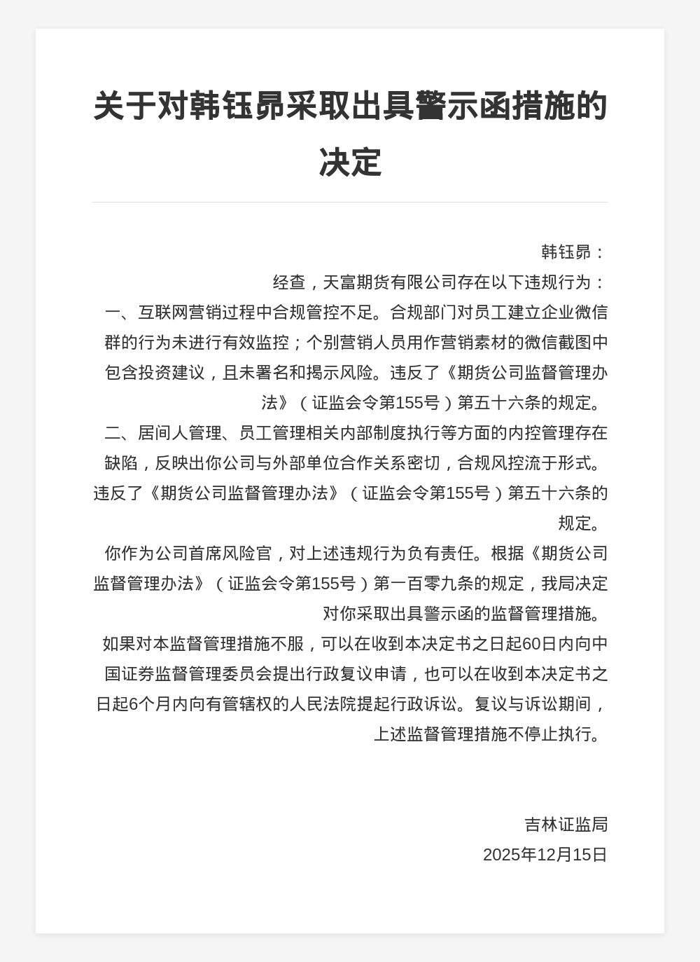 蓝鲸新闻12月26日讯,近日,吉林证监局发布行政监管措施决定书,剑指天富期货有限公司及其相关责任人。