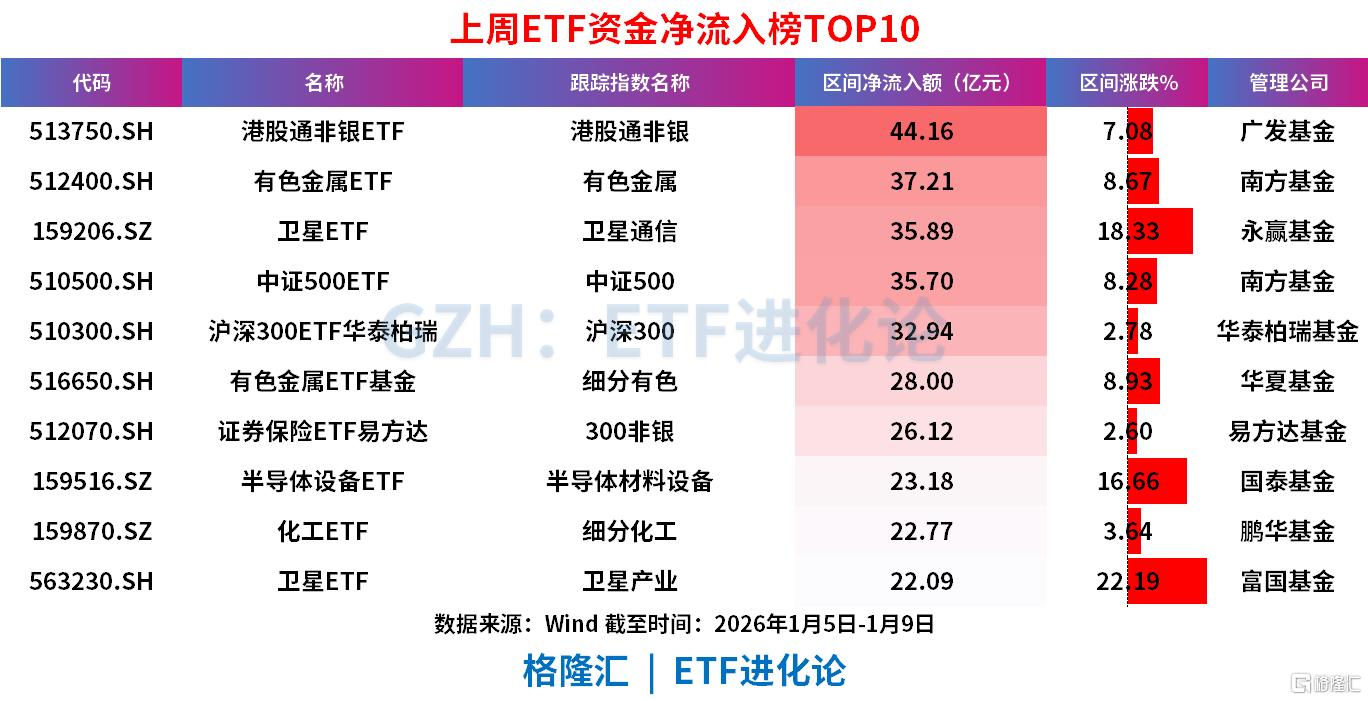 港股通非银ETF、有色金属ETF、卫星ETF、中证500ETF、沪深300ETF华泰柏瑞上周分别净流入44.16 亿元、37.21 亿元、35.89 亿元、35.70 亿元、32.94 亿元。