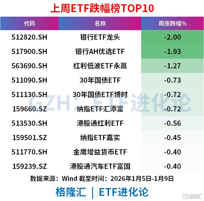 跌幅方面,银行ETF龙头、银行AH优选ETF、红利低波ETF永赢、30年国债ETF、30年国债ETF博时、纳指ETF汇添富分别跌-2.00 %、-1.93 %、-1.27 %、-0.73 %、-0.72 %、-0.72 %。