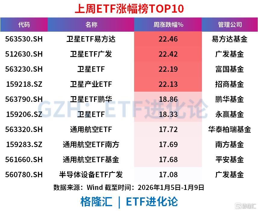 涨幅方面,卫星ETF易方达、卫星ETF广发、卫星ETF、卫星产业ETF、卫星ETF鹏华、卫星ETF上周分别涨22.46 %、22.42 %、22.19 %、22.13 %、18.86 %、18.33 %。