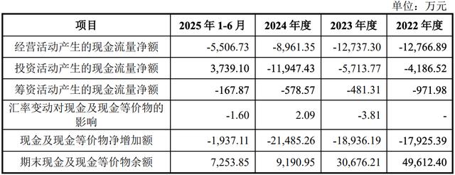 过去几年,必贝特的现金流处于快速消耗的状态。截至2025年6月末,该公司的现金和现金等价物约为7253.85万元,而截至2022年、2023年、2024年末分别约为4.96亿元、3.07亿元和9190.95万元。