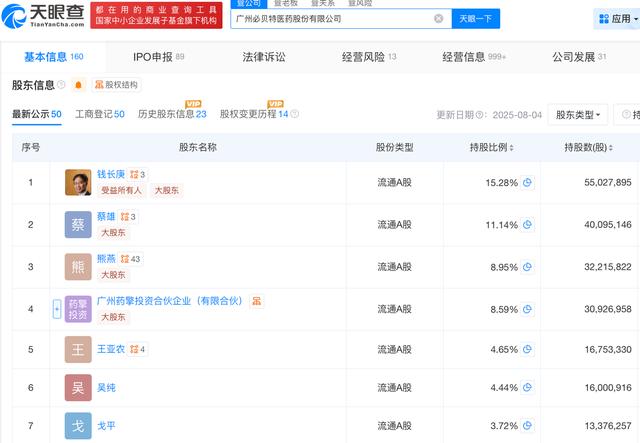天眼查App信息显示,必贝特成立于2012年1月,位于广东广州市。目前,该公司的注册资本约为3.6亿元,法定代表人为钱长庚(QIAN CHANGGENG),主要股东包括钱长庚、蔡雄等。