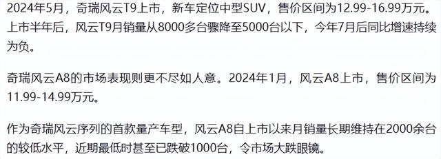 风云系列代表性车型销量大多不理想。据《新浪证券》报道,2024年5月上市的风云T9月销量从8000多台骤降至5000台以下,2025年7月后同比增速持续为负。风云A8自2024年1月上市以来月销量长期维持在2000余台的较低水平,近期最低时甚至已跌破1000台。